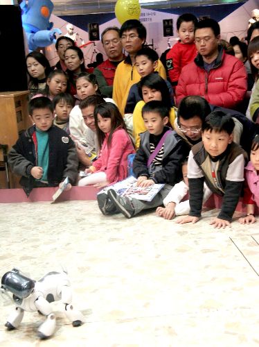 台北“机器人教育展”目前正在信义区新光三越举办。图为主办者借狗年来临,五日展出宠物狗机器人,吸引民众观赏。作者:黄少华