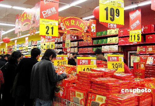 2月5日,据商务部最新监测数据,2006年国内春节市场呈现出购销两旺的红火局面。正月初一至初七,全国实现社会消费品零售总额约1900亿元,比去年春节黄金周增长15.5%,其中餐饮业增长25%左右。图为春节期间市场滋补礼品销售红火。作者:张和平