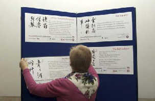 出现在英国地铁车厢内的这些唐诗并没有用印刷体汉字,而是采用了中国书法的形式,同时配以英国汉学家的英文翻译,以便将中国诗歌最传神地传达给西方社会。据悉,这些中国唐诗将在人流量极大的英国地铁里流动展示两个月。