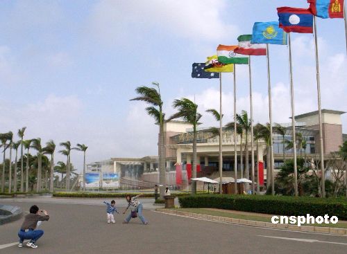 图:游客在博鳌亚洲论坛国际中心前拍照留念