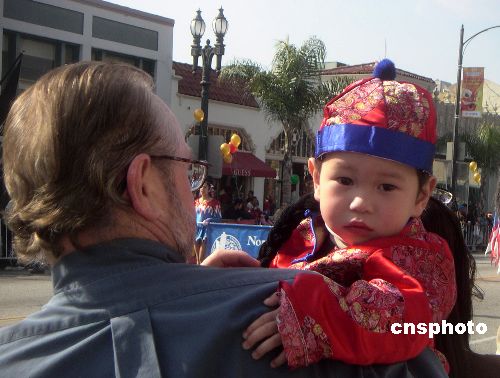 一位美国父亲抱着领养的中国小儿子,喜气洋洋参加洛杉矶华人华侨欢庆中国农历狗年元宵节活动。作者:贾国荣