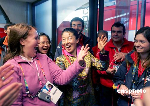 都灵当日时间2月11日,奥运冠军杨扬训练之余在都灵奥运村联想网吧教外国朋友扎中国的幸运结,在中国元宵节之际祝他们吉祥、幸运。作者:武仲林