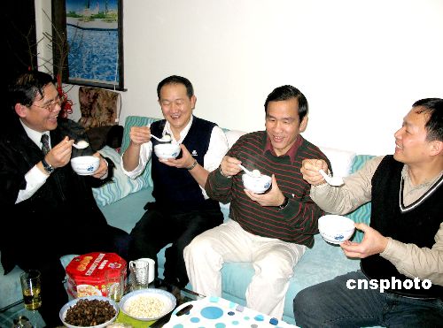 2月12日是传统元宵佳节,2005年12月加盟四川航空的八名台湾飞行员,在成都度过了一个团圆、祥和的佳节。图为张鲁珍(右一)、黄定宇(右二)等在吃汤圆。作者:蔡超