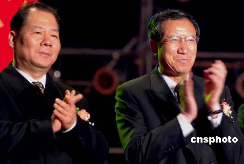 二月十二日晚,第四届“两马”同春闹元宵活动在福州马尾隆重举行。率马祖联欢交流团前来参加“两马”同春闹元宵活动的马祖知名人士曹尔忠(右一)在晚会上。作者:刘可耕