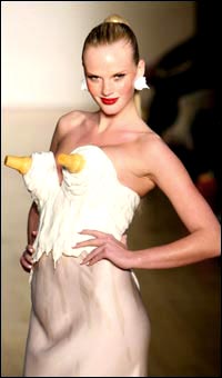 中新网2月13日电 据外电报道,在刚刚过去的纽约时尚周中,著名时装设计师杰里米·斯科特(Jeremy Scott)创造出来的“食品”系列服装堪称整个秀的最大亮点。只见一个个模特身上的衣服均以食物为造型,看看名模Anne Vyalitsyna这身奇特的胸衣,竟然是两个冰淇淋的蛋卷筒扣在了胸上,白色的衣服宛如流下来的冰淇淋,让人不得不称赞设计师的创意,但是,Anne的表情和这件“冰淇淋胸衣搭配在一起,真是让人不舒服!