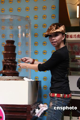 台湾歌坛天后张惠妹2月13日在台北西门町尝试做年轻人流行的“幸福巧克力喷泉”,与歌迷见面。她将于14日“情人节”当天在电台担任二小时的“传爱大使”,最新专辑“我要快乐”亦将在17日发行。 作者:黄少华