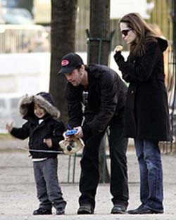 中新网2月14日电 据外电报道,上周五,好莱坞情侣布拉德·皮特与女友安吉丽娜·茱莉,养子马多克斯在巴黎一家公园游玩,身怀六甲的茱莉穿上黑色外套,并没有显出臃肿的体态。即将迎来自己第一个孩子的布拉德·皮特看上去心情非常好,他不时地拥抱着女友,恩爱异常,而且还不忘照顾养子马多克斯,教他玩遥控汽车玩具,一个慈父的形象跃入眼底。