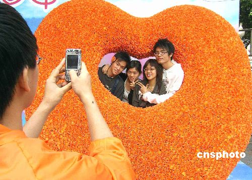 二月十四日情人节,广州街头一个由九千九百九十九朵玫瑰扎成的心形花环,吸引众多情侣合影留念。作者:柯小军
