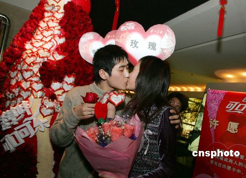 二月十四日是“情人节”,上海一对年轻人在一个用千朵玫瑰打造的“爱心樽”前许愿接吻。作者:潘索菲
