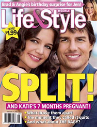 中新网2月15日电 汤姆·克鲁斯与身怀六甲的未婚妻凯蒂·赫尔姆斯情人节闹分手?据外电报道,最新一期的《Life & Style》杂志刊载了这个消息,而该杂志亦以这对情侣的亲密照作为封面,上面写着大字“Split!”(分手!)该杂志指,一位不具名的知情人士透露,阿汤哥向其表示“我们俩早就玩完了!”两人甚至已经分房而睡。杂志的发言人也站出来表示,他们的消息是“百分之百真实的”。