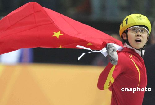 一跃跳上冠军领奖台,做出胜利的“V”字手势,亲吻胸前的五星红旗……二十岁的中国小将王濛今晚实现了自己的梦想,在都灵冬奥会上成为当之无愧的短道速滑女“飞人”,她以自己特有的方式庆祝这个值得中国人自豪的胜利。