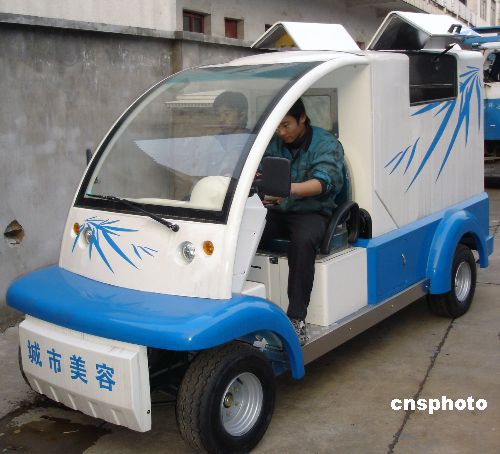 2月17日在苏州平江环卫所拍摄的新型垃圾清运车。近日,一种外形美观的新型垃圾清运车亮相苏州,并将投入使用。这种车依靠电瓶启动,时速可达30公里,车上的垃圾箱带有自卸功能,并有专为环卫工人设置的工具箱和水箱。据悉,这种新型垃圾清运车将用于苏州繁华商业区及旅游景点。作者:王建康