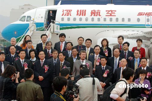 二月十七日下午,两架喷绘深航标志的全新空客A三一九飞机从德国汉堡相继飞抵深圳机场,深航成为该机型在中国的又一家新用户。图为空客与深航举行接机仪式。作者:闻子