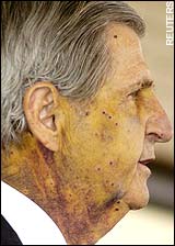 中新网2月18日电 据英国《每日电讯报》报道,在打猎时遭副总统切尼误伤的美国共和党律师哈里·惠廷顿17日在事故发生后首次在公开场合露面。他的脸上仍有霰弹留下的麻点和瘀痕。