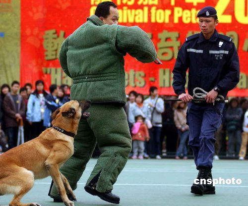 香港警务处警犬队18日在 “宠物嘉年华”表演。图为警犬在警官的训令下,捕捉“疑犯”。作者:谭达明