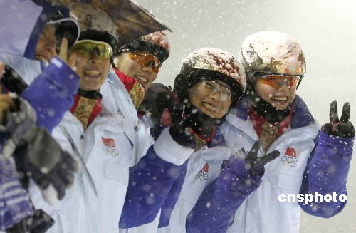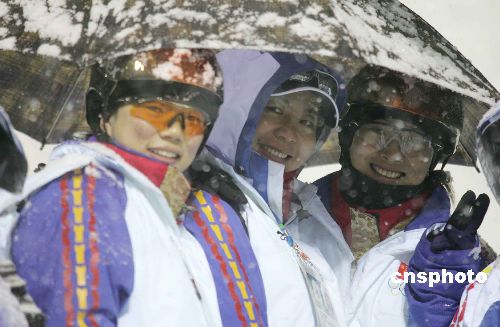 都灵时间2月19日晚,冬奥会自由式滑雪女子空中技巧资格赛因大雪延期,中国金花神情轻松,在大雪中等待比赛消息。作者:武仲林