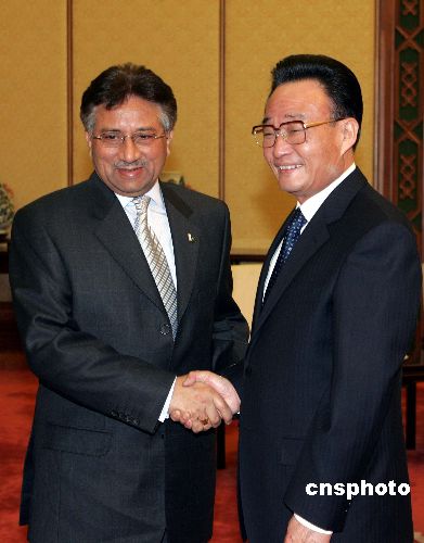 穆沙拉夫昨天傍晚抵达北京,开始对中国进行为期五天的国事访问。今天中午,中国全国人大常委会委员长吴邦国在人民大会堂会见他,并设午宴招待这位邻国贵宾,这是此访期间,穆沙拉夫和中国领导人的第一场重要会见。