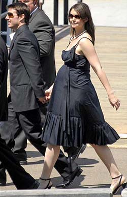 中新网2月21日电 据外电报道,上周四,好莱坞情侣汤姆·克鲁斯偕未婚妻凯蒂·赫尔姆斯前往悉尼,身着黑色低胸吊带裙的凯蒂看上去已经接近产期,挺着大肚子,行动十分不便,但贪靓的她还是穿了一双小巧的高跟鞋,“大鸟依人”般尾随在阿汤身后。