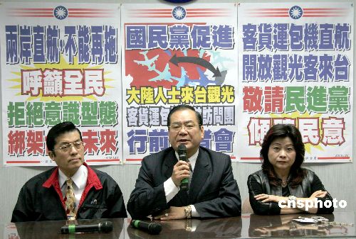 中国国民党组成中央政策会执行长曾永权等六人团21日下午搭机赴北京,与大陆有关方面磋商开放大陆人士赴台观光与客货运包机直航常态化。图为曾永权(中)21日上午在台北行前记者会上,介绍有关情况。左为该党政策会副执行长张荣恭,右为“立委”朱凤芝。据表示,此次磋商是不让陈水扁当局有任何借口再延宕。作者:黄少华
