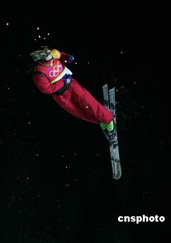 都灵当地时间2月21日晚,中国四名选手在都灵举行的冬奥会自由式滑雪女子空中技巧资格赛中表现稳定,全部进入决赛。图为李妮娜在比赛中。作者:武仲林
