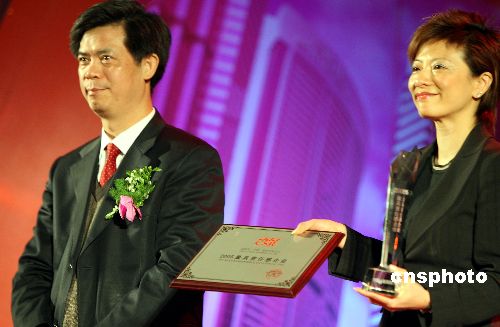 国务院侨务办公室、中国新闻社指导,《中国新闻周刊》杂志社主办的“中国·企业社会责任国际论坛”——“最具责任感的企业”颁奖典礼二月二十二日晚在北京隆重举行。诺基亚(中国)投资有限公司等十家企业获得“最具责任感企业奖”,中国新闻社总编辑郭招金(左)为获奖企业代表颁奖。 作者:廖文静