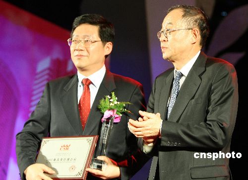 国务院侨务办公室、中国新闻社指导,《中国新闻周刊》杂志社主办的“中国·企业社会责任国际论坛”——“最具责任感的企业”颁奖典礼二月二十二日晚在北京隆重举行。宝钢股份有限公司等十家企业获得“最具责任感企业奖”。国务院侨办副主任刘泽彭(右)颁奖。 作者:廖文静