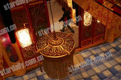 虽然是戒备森严,但是本报记者也拍摄到了部分正在搭设的内景。由于《满城尽带黄金甲》讲述的是一段唐朝的宫廷戏,所以宫殿及居室便成为了其中的重要场景。而这部分场景也全部集中在了北影摄影棚里一个约4层高的楼中。记者进入到内部看到,工人们还在忙着做最后的搭景工作,而这个面积约几百平方米的棚中,也被分隔成为宫殿、内室等多个隔断。由于地上铺满了绣有各种花的地毯,所以工人们都是套着专业的鞋套工作的。宫殿及各内室是以金黄、红两色为主线,包括内柱、门、窗、坐椅等装饰也都被涂上了金黄、红及绿色,一眼看去很是金碧辉煌,不过家居的风格则更像是清代。而仔细看这些场景又更类似于张艺谋《十面埋伏》中的重要场景“牡丹坊”。
