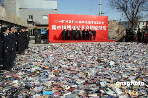根据全国“扫黄打非”工作小组统一部署,中国“二00六年‘扫黄打非’春季战役非法出版物集中销毁活动”二十三日在北京、河北、山西、辽宁、河南、江苏、湖南、湖北、广东、四川、甘肃等十一地同步举行,据不完全统计,此次声势浩大的活动共集中销毁各类非法出版物一千多万件。