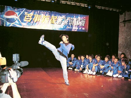 中新网2月24日电 谢霆锋昨日出席百事新星音乐训练营担任评判,来自内地的参赛者又唱又跳还表演功夫,霆锋见状实时露出真功夫,舞刀弄剑,还即场教参赛者翻腾踢腿。据香港媒体报道,霆锋为了担任代言人非常卖力,还跳到束起头发,不过他说自己没资格开武术学校,其功夫都是从拍戏学回来的。