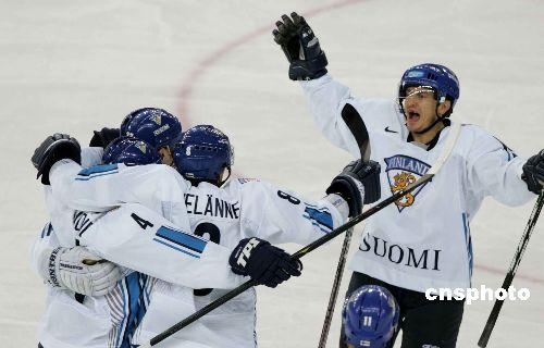 都灵时间2月24日,芬兰队(白)在冬奥会冰球半决赛以4:0大胜俄罗斯队(红),进军决赛。作者:武仲林