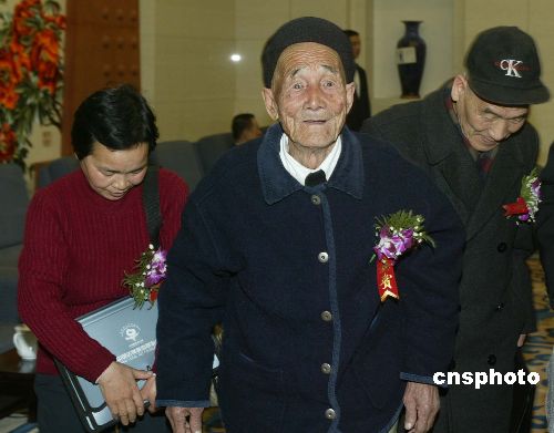 二月二十五日,中国受害劳工、对日索赔案原告刘千老汉在人搀扶下出席在北京人民大会堂举行的“中国民间对日索赔法律援助行动”的捐赠仪式。尽管对日索赔诉讼案大部分已败诉,有关组织力争在中国国内拉开民间对侵华战争犯下罪行索赔的“第二战场”,坚持把官司打下去。作者:史利