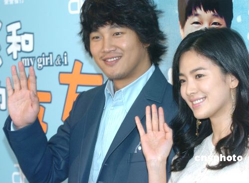 韩国浪漫爱情电影《我和我的女友》将于3月9日在香港上映﹐剧中男女主角车太铉﹑宋慧乔2月26日在香港亮相﹐为该片宣传造势。作者:赵振清