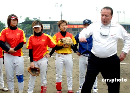 国家体育总局将垒球列为北京奥运会争取金牌的潜优势项目,最近聘请前美国垒球队的金牌教练迈克尔·巴斯蒂安打造新一届中国女垒。图为主帅迈克尔对中国女垒讲解战术理论。作者:何泉