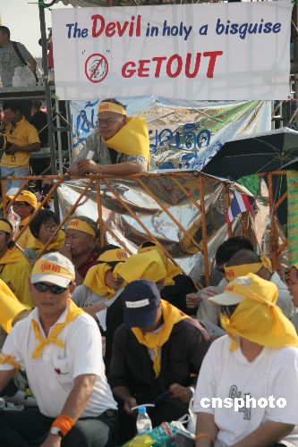 泰国第三波反政府集会二十六日在曼谷皇家田广场登场,呼吁塔信总理下台,尽管泰国政府已经宣布解散国会、四月二日举行新的大选。图为张悬广场的一条横幅,上面用英文写着呼吁塔信下台的言辞,格外醒目。作者:罗钦文
