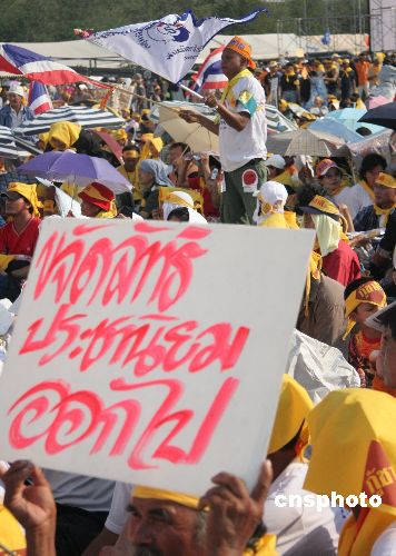 泰国第三波反政府集会二月二十六日在曼谷皇家田广场登场,呼吁塔信总理下台,尽管泰国政府已经宣布解散国会、四月二日举行新的大选。图为集会者聚集在广场上临时搭建的恶一个舞台前,顶着烈日席地而坐,进行和平抗议。 作者:罗钦文