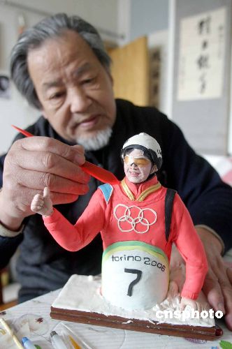 2月27日,山东省民间面塑大师何晓铮对制作的面塑作品《冬奥健儿韩晓鹏》做最后的修整。韩晓鹏在冬奥会夺得自由式滑雪男子空中技巧比赛的冠军,为中国男子冬奥金牌实现零的突破,何晓铮花费2天时间做出《冬奥健儿韩晓鹏》的面塑作品,该作品高24公分,宽21公分,用2公斤面制成,表现了韩晓鹏夺冠后的喜悦。作者:龚辉