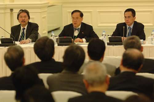 昨日下午三时半左右,政协委员陆续抵达礼宾府。包括政协常委李泽巨、政协委员龙子明、吕明华、施子清、黄守正、朱莲芬、曾钰成、田北俊、刘兆佳等近百人出席了会晤。曾荫权作了简短的开场白后,委员们陆续发言,共有十九名委员发表了意见,每人发言数分钟。委员们发言完毕,曾荫权并没有个别回应委员们的问题,只是作了概括性的总结。会议进行了大约一个半小时。