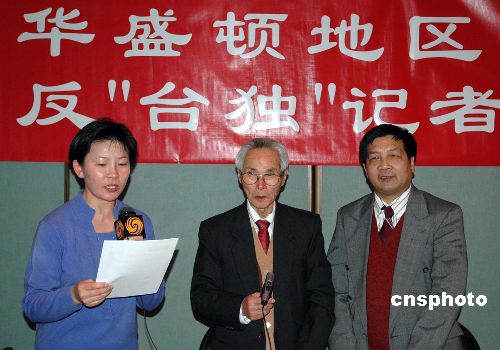 美国大华盛顿地区侨界2月28日晚举行记者会,抗议陈水扁当局终止“国统会”和“国统纲领”。这是华盛顿和统会侨领在宣读侨界致台北“驻美代表处”的抗议信。作者:姜平