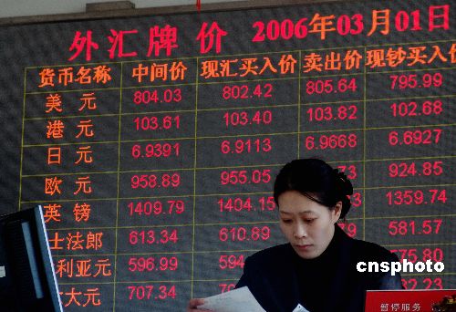2006年3月1日,中国外汇交易中心公布当日人民币对美元汇率中间价为8.0390:1,再次创下自2005年7月21日汇改以来的人民币汇率新高。这也是人民币汇率首次突破8.04:1。作者:马健