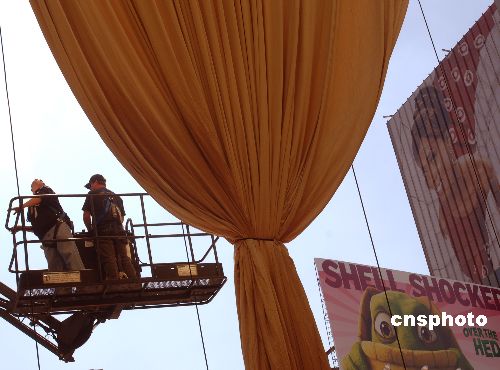 三月一日,美国第78届奥斯卡组委会的艺术家在好莱坞柯达剧场前升起金色帷幕,金像奖名单将于三月五日晚在此举行的颁奖典礼上一一揭晓。作者:贾国荣