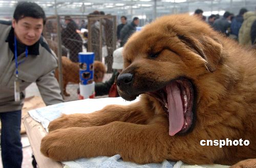 3月4日,一只三个月大的虎头型小藏獒午后略带困意,此次在北京参加2006首届中国藏獒展示会身价五万元人民币。本次展示会集中展出中国各地数以百计的优秀藏獒,其中有狮头型、虎头型藏獒及铁包金、黑色、金黄色、红棕色、雪獒等。作者:张宇