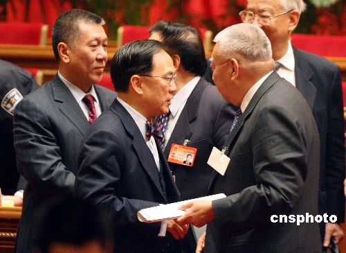 三月五日上午,十届全国人大四次会议在北京人民大会堂开幕,列席会议的全国政协副主席、香港特别行政区前行政长官董建华,与香港特别行政区行政长官曾荫权、澳门特别行政区行政长官何厚铧在主席台上交谈。作者:毛建军
