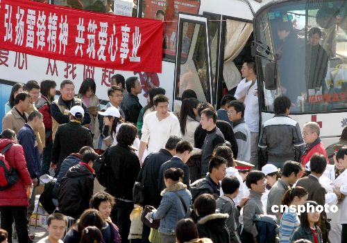 3月5日,北京西单文化广场,路人涌在献血车前踊跃献血。当日是毛泽东主席发出“向雷锋同志学习”题词四十三周年纪念日,中国各地均以不同形式的公益活动宏扬雷锋精神,北京血液中心的工作人员在闹市为献血的市民服务,路人争先报名献血,现场人头攒动。作者:廖攀