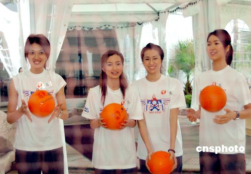 香港排球总会主办的2006世界女排大奖赛-香港站将于8月份在香港体育馆举行,3月6日,香港无线电视女艺员[左起]林莉、李思欣、沈颖婷、李亚男在记者会上,即兴进行排球挑战游戏。作者:洪少葵