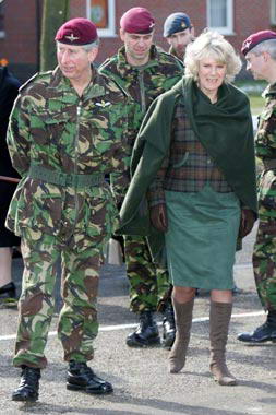 在这次慰军活动当中,查尔斯和卡米拉与士兵聊起了他们即将前往阿富汗执行任务的情况以及在阿富汗他们将面临的生活条件等。其间,卡米拉还亲手查看了一些军事装备,并向士兵请教使用这些装备的方法,感觉她正在极力试图让自己看上去更和蔼和平民化。此外,查尔斯和卡米拉还接见了一名年轻伞兵的遗孀,这个名叫里查德·霍尔姆斯的上尉上个星期刚刚在伊拉克战场上阵亡。