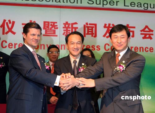 3月10日,北京长城饭店内中国足球协会副主席谢亚龙、南勇与英国爱福克斯公司约翰先生的手握在了一起,备受关注的2006年中国足协超级联赛的冠名赞助商揭开了面纱。来自英国经营网络产业的爱福克斯公司经中国足协批准正式成为2006中超联赛新的冠名赞助商。作者:廖攀
