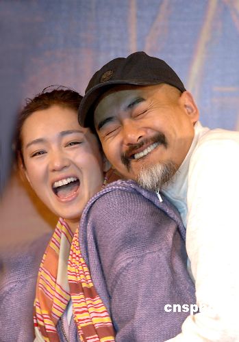 三月十一日,新片《满城尽带黄金甲》新闻发布会上,周润发亲密熊抱巩俐。导演张艺谋及两位主演周润发、巩俐出席北京电影学院礼堂首次新闻发布会揭秘整台“黄金宴”。作者:韩艺冰