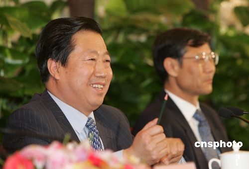 三月十一日,国家环境保护总局局长周生贤、国家发展和改革委员会副主任姜伟新和国土资源部副部长李元,在北京人民大会堂就建设资源节约型和环境友好型社会答中外记者问。图为周生贤被香港大公报记者提出的“若再有重大环境污染事件发生,周局长是否也会像前任那样被问责、解职”的问题逗笑。作者:郭晋嘉