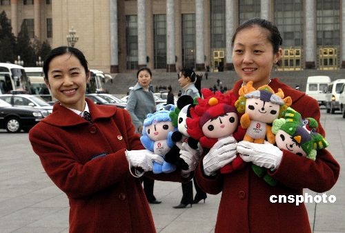 图:“两会”礼仪小姐怀抱“福娃”成亮点