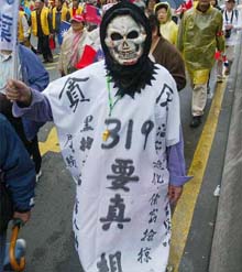 泛蓝阵营12日举办“拼生活‧救台湾”大游行,虽以“顾民生、拚经济”为主题,在陈义雄家属翻案的同时,也有民众于队伍中再度质疑“319枪击案”的真相,带着骷髅面具,要求还原事实真相。(台湾《中国时报》图 ,陈信翰摄)
